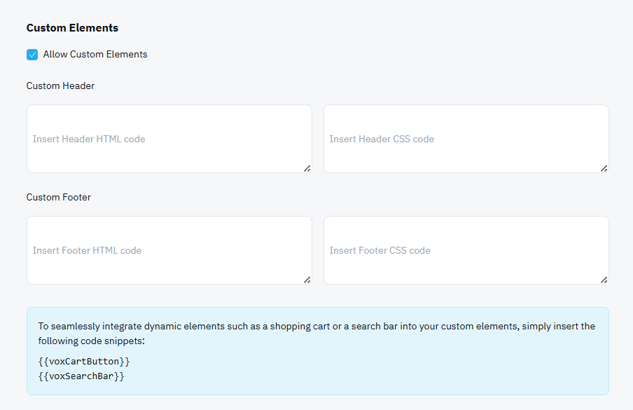 To seamlessly integrate dynamic elements such as a shopping cart or a search bar into your custom elements, simply insert the following code snippets